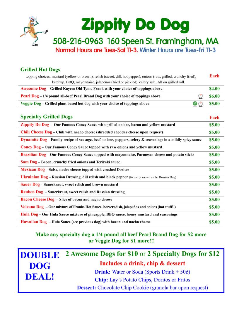Since the mid-2000s, Zippity Do Dog has served Framingham as a beloved local eatery known for simplicity and flavor. Housed in a converted trolley car, this unique setup combines nostalgia with casual dining, drawing in residents, families, tourists, and trail explorers. Located at 160 Speen St, our trailer sits adjacent to ample free parking and the scenic Cochituate Rail Trail, making us convenient for both quick stops and leisurely lunches.
